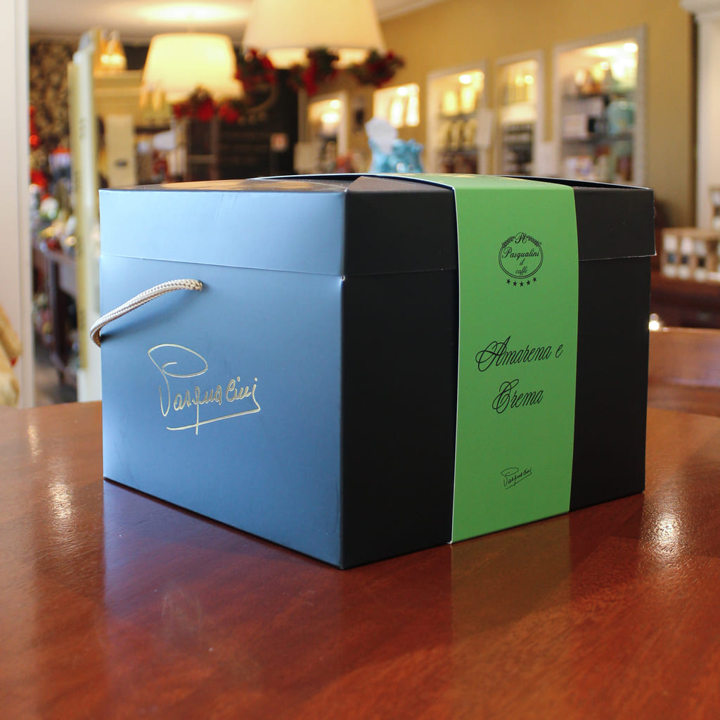 L’impasto classico del panettone a lunga lievitazione, estremamente soffice, accoglie la crema pasticcera che lo rende morbido e scioglievole, la cui piacevolezza ben si equilibra con il fruttato dell’amarena.
